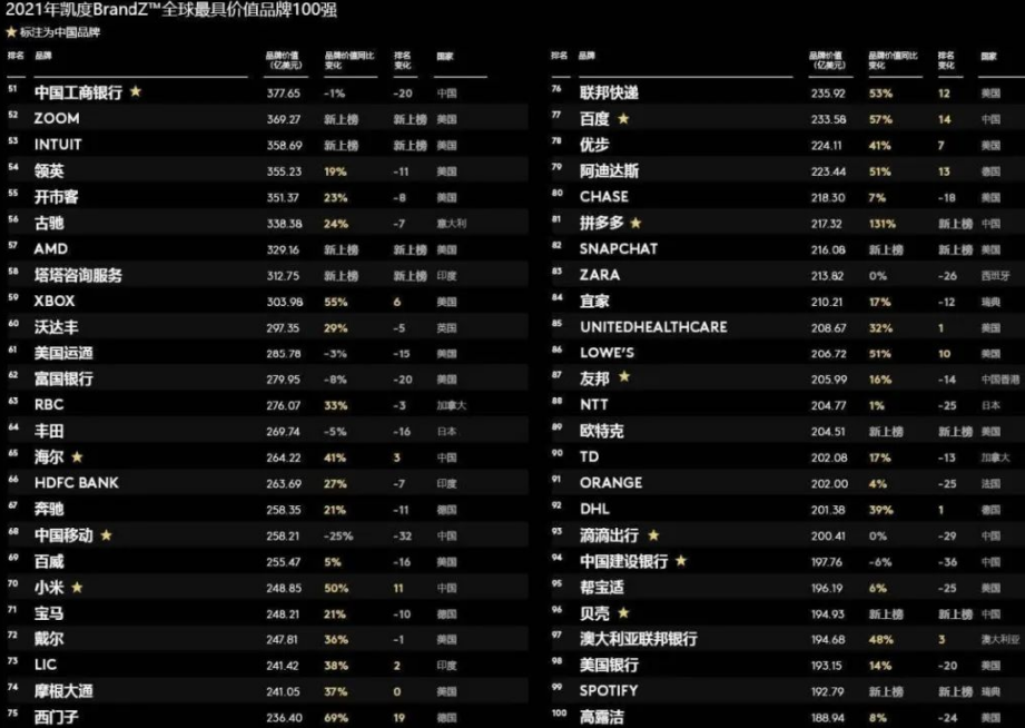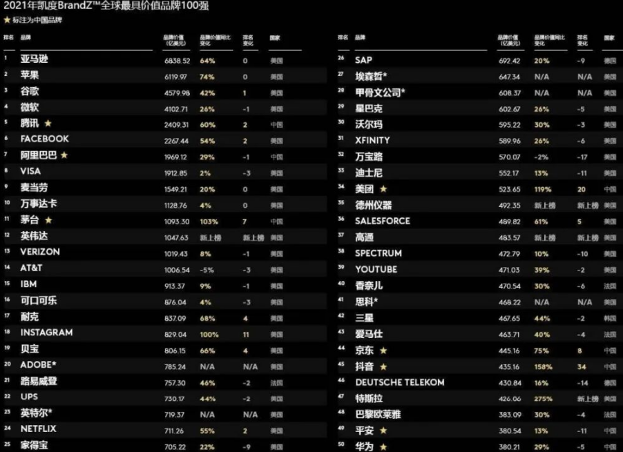 BrandZ2021凱度最具價值全球品牌Top100 - 品牌時代 2022/08 + 6月21日,2021年凱度BrandZ最具價值全球品牌排行榜發布。亞馬遜衛冕全球最有價值品牌寶座,上榜中國品牌達到18個,品牌價值增速最快的是特斯拉。 【上篇】無效失敗,“六個核桃”經宣傳使用獲得了顯著性【下篇】2021全球最具價值500品牌大榜