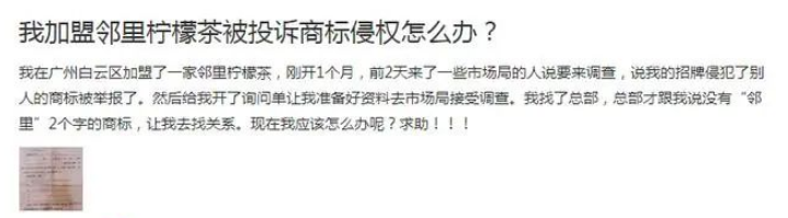 近日,從網絡上看到一則消息,廣州白云區一茶飲店加盟商陳先生在網絡發帖求助:我加盟鄰里檸檬茶被投訴商標侵權怎么辦?據悉,陳先生在廣州白云區加盟了一家“鄰里”檸檬茶,剛開1個月,就被舉報其“鄰里”招牌侵犯了別人的注冊商標。為此,白云區市場監管局執法人員開了詢問單,責令陳先生立即停止侵權行為,并依法扣押了侵權物品。